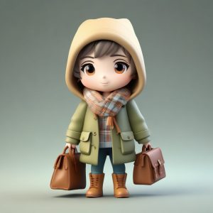 想要活力满满的Q版角色?使用3D渲染、光线追踪和粘土材质,生成身穿潮流冬日羽绒服的洛丽塔全身站立照,表现兴奋表情。