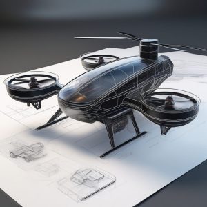一个低角度视角展示的流畅自适应模块化探索无人机概念。以工业设计草图风格渲染,侧重于产品概念可视化。采用逼真的马克笔绘图技法,强调在有纹理的白纸上通过Copic 马克笔渲染实现的平滑色彩渐变。使用动态线条粗细来定义形式和结构。包含一个详细的视图图解,展示内部机械组件和模块化连接点。灯光应强烈,模拟顶部工作室照明,设备下方有清晰的阴影。使用充满活力的、高对比度的颜色(例如,在哑光黑色外壳上的霓虹橙色强调)。背景中隐约可见正交投影元素用于技术参考。整体美学必须传达快速原型制作和复杂功能。