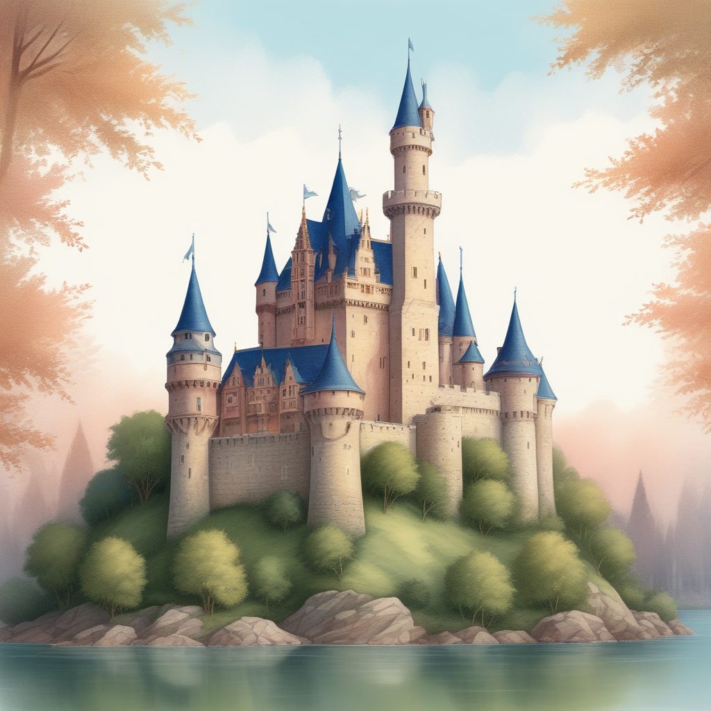 一幅充满(whimsical)和古典浪漫的欧洲城堡插画,沐浴在柔和的光线下。该作品采用强烈的(storybook style)和高细节的(illustration:1.2)构图。色彩以柔和的(pastel colors)和温暖的色调为主。笔触结合了(colored pencil:1.2)的细节和(crayon style:1.1)的粗犷感。整体风格为(hand drawn:1.3),具有明显的(textured paper)质感和柔和的(soft edges)。