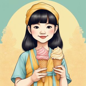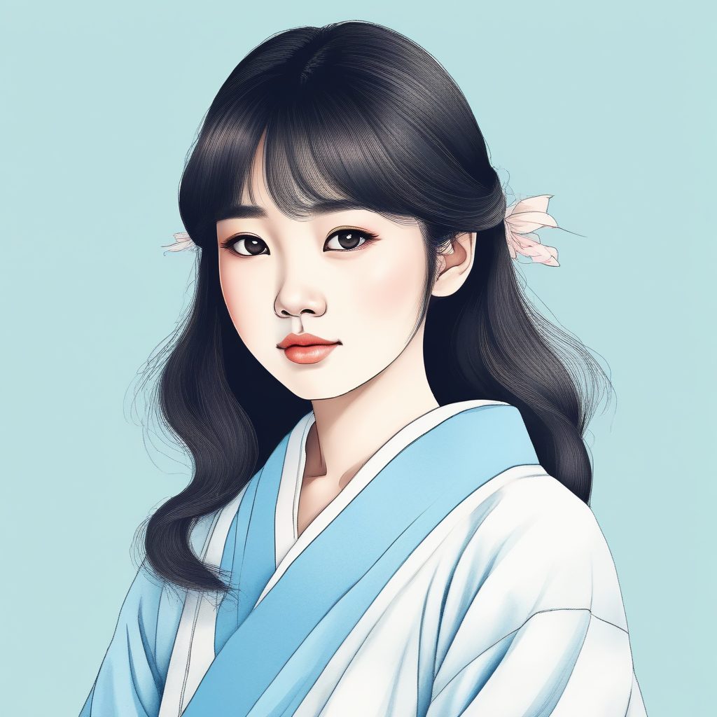 Hand drawn illustration of a cute Japanese girl portrait in Korean ‘Salt Style’ fashion. Features predominant pastel colors and subtle warm colors. Crayon style combined with colored pencil on textured paper. Very soft edges, whimsical storybook style. Solid light blue background.