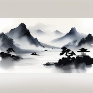 AI art prompt English:Tranquil Japanese landscape, sumi-e ink painting style, misty mountains, minimalistic brushwork, serene river, traditional paper background, peaceful Zen scenery