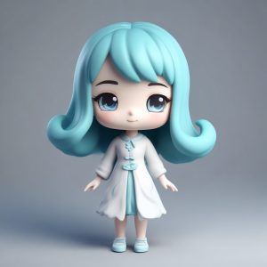 一个全身站立的可爱Q版女孩,身着以荷花和鱼灯为主题的清雅国风服装。她是Pop Mart盲盒风格的黏土手办,特征是圆润光滑的chibi造型。超高细节8K 3D渲染,使用C4D和Octane引擎。她手持一盏鱼灯,被柔和的工作室照明和精确的光线追踪照亮。色彩是柔和的淡粉、浅青色和白色。背景是干净、简单的纯浅青色,完全空白,无图案。