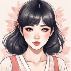 A minimalist hand drawn line art illustration of a cute Japanese girl anime portrait. Emphasizing under eye blush and glossy lips. The illustration uses soft pastel colors, featuring crayon style and warm colors. The overall aesthetic is whimsical and storybook style, soft edges, distinct textured paper, solid color background.