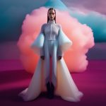 A minimalist surreal fashion dreamscape showcasing a single transparent glass apple placed on a solid pastel blue background. The composition is clean, with no patterns or textures present. The apple’s surface reflects gentle highlights and refracts subtle rainbow colors, giving a surreal, dreamlike quality. Editorial fashion lighting is utilized to add depth. The overall scene is visually simple yet sophisticated.