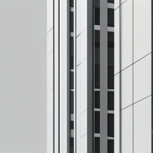 Minimalist urban architecture concept illustration, fine linework, geometric high-rise buildings, subtle shading for depth, monotone grayscale, clean and spacious layout.