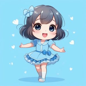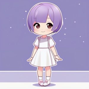 Minimalist Anime Style Kawaii Chibi Girl Full Body, Big Eyes, Short Hair, Pink Dress