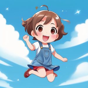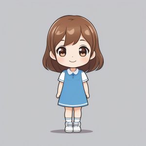 A minimalist anime illustration of a cute chibi girl with big sparkling eyes and short brown hair. She is wearing a simple pink dress and standing in a relaxed pose. The lines are clean, with bold outlines, and the colors are flat and bright. There is no shading or extra details on the character. The background is a solid pastel color, clean and without any patterns or decorations. The composition is centered, emphasizing the girl as the main subject.