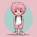 A full body illustration of a minimalist kawaii chibi anime girl with a big cute smile, standing against a solid pastel pink background, her outfit is simple with no patterns, soft rounded shapes, large sparkling eyes, clean lines, no shading or extra detail, gentle cartoon colors highlighting her youthful charm.