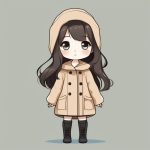 A cute chibi anime girl in an oversized red scarf and orange sweater, full body view, simple solid brown background, large shining eyes, small soft mouth, short wavy hair, gentle pose, clear bold outline, no background clutter, minimalist feel.