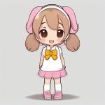 一个全身极简Q版动漫少女,青蓝色短发,白色荷叶边裙装,纯浅桃色背景,平涂画风,粗顺滑线条,温柔宽大双眼带柔光,清晨清新表情,极为干净无图案装饰。
