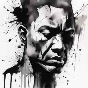 Minimal urban sketch of a young boy with a bicycle, loose expressive ink lines, very few colors, blank space dominating the background, spontaneous and modern street vibe, contemporary minimalist illustration