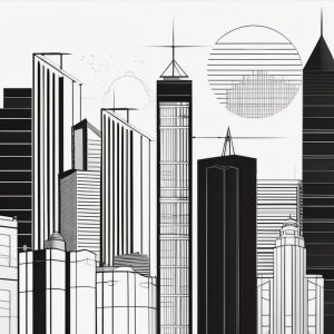 AI art prompt English:minimalist line art, urban skyline with geometric buildings, flying birds, contrast black and white, poster style, sleek modern decor
