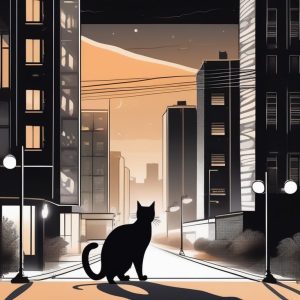 AI art prompt English:Minimalist cityscape poster, a cat walking on urban rooftops, simple lines, soft pastel colors, flat composition, modern vector art