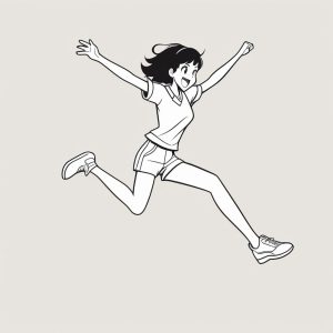 Minimalist anime girl with twin braids, eyes closed and smiling brightly, solid coral pink background, flat vivid coloring, simple clean outlines, minimal detail, cute round face, lively and cheerful expression, uncluttered style.