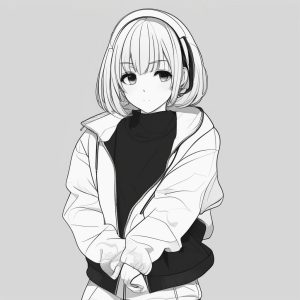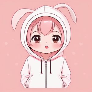 一个可爱极简二次元女孩全身照,双手捧脸,脸颊微鼓,背景是干净纯色,采用平滑柔和色调,服装轻盈,面部和头发细节极简,大而圆亮的眼睛,粗而简单的线条表现。