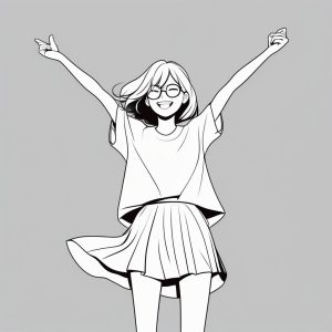 极简风格二次元全身少女,玩闹般单脚站立,双臂伸展,背景为简单纯色,基本款学生制服,童真快乐微笑,圆眼带高光,整体线条干净无装饰。