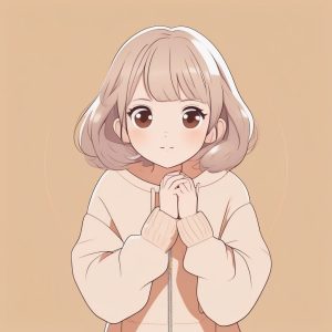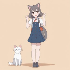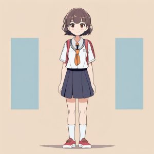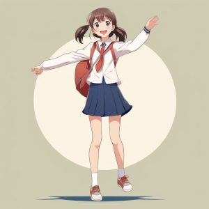 Minimalist anime style full body girl raising both hands in joy, background of pure clean single color, simple but expressive face with wide smile, shirt and skirt in flat shades, bouncy pointing fingers, minimalistic hair, crisp black outlines.