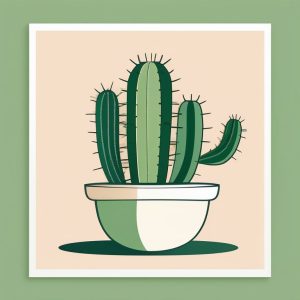 A minimalist conceptual art illustration of a single cactus in a modern white ceramic pot, placed on a solid pastel pink background. The cactus is drawn with simple geometric lines, no shading or gradients, only flat muted green and soft white colors. The composition is clean, with negative space around the subject for balance. There are no background patterns or extra details to distract from the cactus.