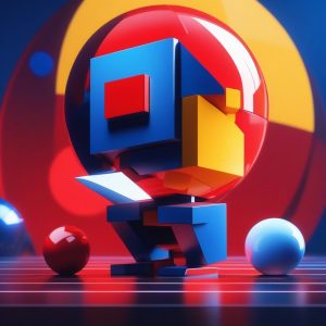 AI art prompt(English) – Minimalist Composition: AI Illustration of Pink-Blue Girl Sitting on a Geometric Cube