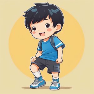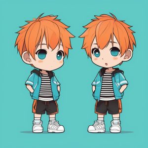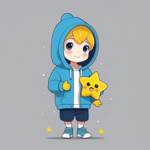 AI art prompt English:Minimalist Kawaii Chibi: Blue Sweater Boy Holding a Star Against a Pink Background