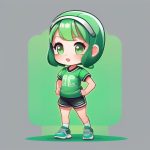 A minimalist kawaii chibi boy with a big head and small body, wearing a bright blue hoodie and white sneakers, making a cheerful jump pose, round sparkling eyes and a wide smile, set against a solid clean mint green background, flat colors, bold outlines, no shading or textures, full body visible, playful and energetic, cute and moe style.