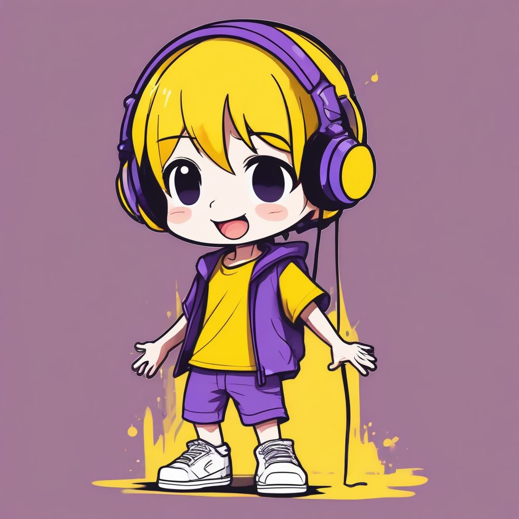 A minimalist full body chibi anime boy, purple headphones over short hair, simple T-shirt and shorts, dancing lightly on a solid pure yellow background, bold black outlines, very minimal details, flat color, happy and fresh anime style.
