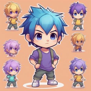 A chibi anime boy with short brown hair, smiling expression, minimal facial details, simple blue overalls and white shirt, full body, outlined with bold lines, standing on a solid light blue clean background, no extra details in the scene.