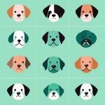 极简流行海报风格下的一只小狗,安放在纯黄色背景。线条粗实明快,无毛发细节,大而愉快的眼睛,耳朵有小色块点缀,传达活泼气氛。