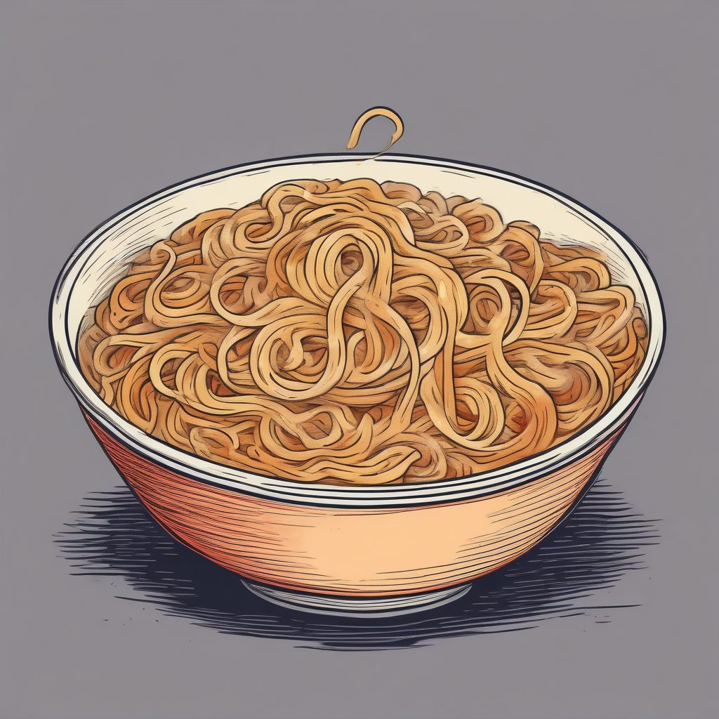 A minimalist line art food illustration, depicting a bowl of steaming noodles or a delicate meal. Rendered in a crayon style hand drawn illustration, utilizing warm colors and soft pastel colors. Emphasis on rough paper texture and soft edges, conveying a whimsical storybook style.