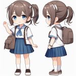 A minimalist full body chibi anime girl with long brown hair and orange overalls, standing on a pure light orange background, big sparkling eyes, smiling face, simplified limbs, bold cartoon lines, flat color scheme for a youthful, vibrant feel.