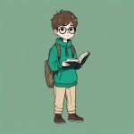 A kawaii minimalist anime chibi boy wearing a bright red scarf and a simple white sweater, cheerful full body pose, small hands in pockets, drawn with clean bold lines, large sparkling eyes, no background detail, only a soft solid beige backdrop, flat colors and super simple design.