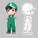 A full body minimalist chibi boy in a cute anime style, holding a small green umbrella, simple denim shorts and t-shirt, set against a clean solid pastel pink background, features large expressive eyes, bold clean lines, flat coloring, round and chubby design, no background complications.