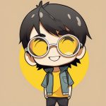 A minimalist full body chibi anime boy in a bright green t-shirt and blue jeans, simple happy face, brown short hair, standing cheerfully on a clean solid white background, the illustration is created with flat colors, bold outlines, smooth rounded shapes, without any textures or background elements.