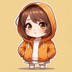 A full-body minimalist chibi girl with short bob hair, wearing purple overalls and white sneakers, simple solid light gray background, round oversized head, small pointy nose, delicate smile, bold black outline, soft pastel colors, overall kawaii aesthetic.