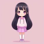 A minimalist chibi anime girl in a plain white t-shirt and dark blue skirt, straight short black hair, standing on a solid plain lilac background, cute big eyes, small smiling mouth, proportionally big head, clear bold outlines, flat colors, very simple aesthetic.