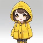 A full body minimalist chibi anime girl wearing a watermelon red dress, brown bob cut, standing on a solid light blue background, very big and bright eyes, small open mouth, simple round limbs, bold outlines, flat colors, adorable and crisp design.
