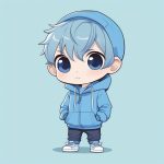 A minimalist chibi anime boy wearing blue denim overalls, full body shot, standing with straight arms on a solid blue background, round eyes, tiny mouth, all details reduced to simple shapes, soft and muted color palette, bold lines, no background elements.