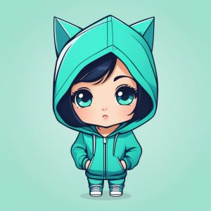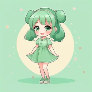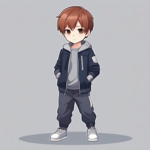 一个极简Q版女孩,穿着经典日本学生制服,全身照,站在纯浅灰色背景上,简单几何造型,大而有表现力的眼睛,线条粗黑,深蓝与白色扁平配色,展现友善天真,无多余细节。