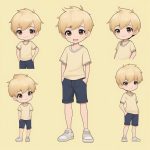 A minimalist chibi anime boy with a big blue schoolbag, wearing a white shirt and dark blue shorts, standing full body on a plain light blue background, head slightly tilted, simple proportions, pure flat coloring, simple facial expressions, bold outlines, background devoid of details.