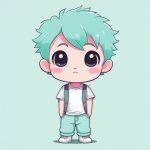 A kawaii minimalist anime chibi boy with striking deep blue eyes, simple brown hair, wearing orange overalls, hands by his side, full body shot placed on a spotless solid light peach background, simple soft-shaped design, flat and clean coloring, no patterns or extra details.