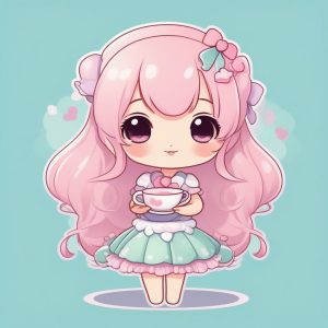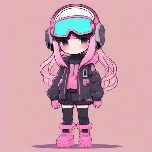 A young chibi girl in a joyful jumping pose, big sparkling violet eyes and long twin ponytails, dressed in a simple white shirt and shorts, full body, against a pure solid light pink background, in a cute and minimalist style, no details on background, expressive happy face, bold black lines, soft color palette.