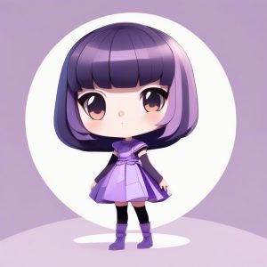 一个正处于跳跃姿态的年轻Q版女孩,全身像,拥有大大闪亮的紫色眼睛和长长的双马尾,身穿简约的白色上衣和短裤,背景为纯净的浅粉色,整体风格可爱极简,背景无任何细节,脸部表情快乐富有表现力,黑色粗线条,柔和色调。