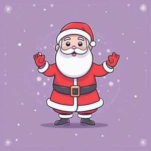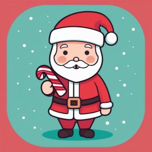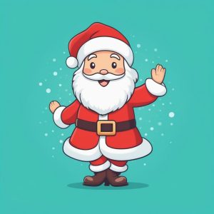 Chibi-style Santa Claus in a standing pose, minimalist anime character with rounded shapes and oversized head, simple flat coloring, wears a red coat and matching hat, rosy cheeks, big eyes, and soft smile, background is a solid pastel green, no additional details or shading.