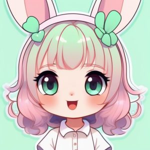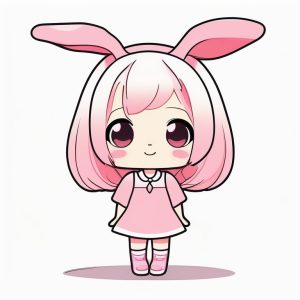 A minimalist full body chibi girl with bunny ears headband, pastel pink hair, white shirt, mini skirt, standing happily, plain light solid color background, cartoonish thick outlines, adorable innocent look