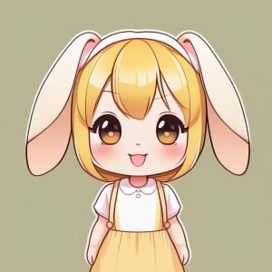 一个极简Q版全身少女,戴兔耳发箍,浅粉色头发,白色上衣和迷你裙,开心站立,浅色纯色背景,卡通粗线条,天真可爱的外观
