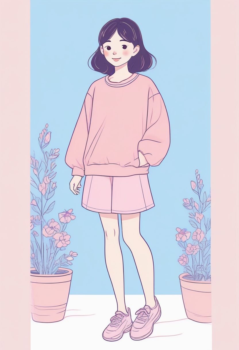 全身插画,非常简单的涂鸦和可爱的涂鸦美感。重点是清晰度和极少细节。女孩站着微笑,穿着粉蓝色服装。艺术风格以突出的柔和圆润的线条为特色。整个图像具有轻松愉快的迷人美感,仅以柔和色调着色,特别是温柔的粉薰衣草色和婴儿蓝,突出了她天真活泼的表情。