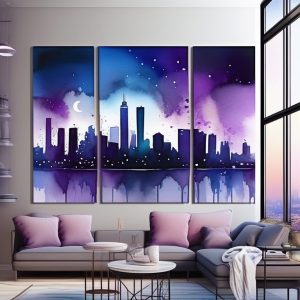 AI art prompt English:minimalist line drawing of a city skyline at night, glowing outlines, simple shapes, dark blue background, sleek modern poster, urban architecture concept art