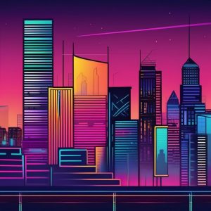 AI绘画提示词中文:都市夜晚的极简线条艺术海报,彩色霓虹线条勾勒高楼大厦,运用几何图形,现代感强烈,抽象的城市氛围。