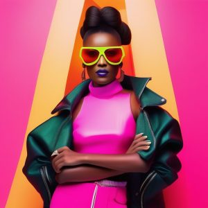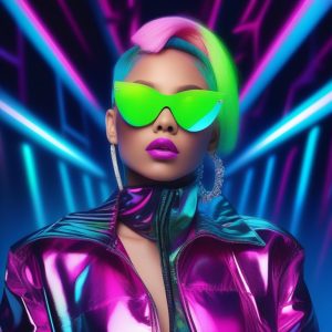 一张极简荧光Y2K风格的时尚女生人像照片,女生穿着明亮的霓虹色服饰,直短发,唇部闪亮,背景为纯色、干净的背景,画面简洁无任何细节,聚焦女生面部和上半身。强烈的荧光色彩和柔和的灯光,现代而大胆的美学。流行的妆容和Y2K发饰,拍摄清晰,细微阴影,质感平滑。