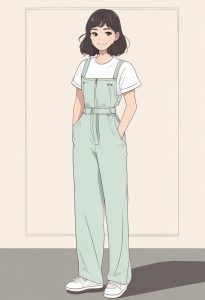 Solo focus, Anime minimalist style illustration, full body standing portrait of a smiling fashionable girl, wearing a basic tank top with simple jewelry. Defined by thick bold outlines, flat color filling and subtle cel shading. Macaron color palette, low saturation, desaturated hues. Background: solid color, clean, simple, completely empty, no patterns, no details.